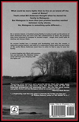 On a remote island off the coast of Maine, a troubled family is trying to pick up the pieces of their shattered lives and start over. But unbeknownst to them, the property they have inherited is steeped in ancient magic – magic that could seek to destroy and devour them.An arcane locked box, a strange and foreboding trail into the woods, a seductive young woman, and tales of a malevolent Indian spirit, are just some of the perils Karen Andersen must face in order to find a way to save her family.A spine-tingling tale filled with passion, lies, and betrayal, Ms. Watkins debut novel, will have you sleeping with the lights on!PRAISE FOR MATEGUAS ISLAND:»Native American folklore blends with a tale of suspense and horror in the multifaceted Mateguas Island….Mateguas Island employs a device other authors (most notably Stephen King in his classic novel The Shining) have successfully used in placing danger both outside and within the family structure…. Surprising twists and turns and a powerful old box filled with magic: these are the elements of a fine horror story that slowly builds its plot with believable protagonists and engrossing color…Any who like horror stories and gothic fiction will find Mateguas Island an exceptional read.» ~Midwest Book Review» …a frightening read that only gains in intensity the further you dare to go.» ~H. William Ruback, author of «the SHORT of it…»»MATEGUAS ISLAND will draw you into its world, page after page. Read it tonight after the sun sets and darkness grips your home.» ~Robert James Jackson, author of «Moon Strike»»MATEGUAS ISLAND is a crisp story for a stormy night when the house is creaking, rain is rattling on the window panes and you just know Something is Out There.» ~J. Scott Payne, author of «A Corporal No More.»»From the first goose bumps when you learn of the old Indian woman’s death to the final conclusion of this book, Linda Watkins keeps you mindful of that macabre presence waiting for you just beyond the shadows where things can and do turn deadly.» ~Steve LeBel, author of «Bernie and the Putty.»»MATEGUAS ISLAND by Linda Watkins is a suspenseful novel that quickly pulled me in with well-developed characters, a tight plot and a fascinating story line…One of the best I’ve read in this genre. It kept me up reading late into the night.» ~Darlene Blasing, author of «Bargain Paradise»»I was immediately transported to this rocky sea-side setting and the sense of isolation was conveyed easily. There is just enough suspense to keep the reader hooked…I would recommend this book to anyone looking for a good page-turner to curl up with!» ~Melissa Miles, Melissa’s Reviews»Mateguas Island is a well written book!!…I truly love endings that make me drop my mouth because I didn’t see it coming! I can not wait to read more from this author!! Great book!!»~Barb’s Review – Goodreads