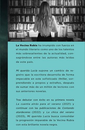 La Vecina Rubia ha irrumpido con fuerza en el ámbito literario como uno de los talentos más sobresalientes de la actualidad, consagrándose entre las autoras más leídas de este país. Mi querida Lucía supone un cambio de registro que la escritora desarrolla de forma impecable en este sofisticado thriller, sorprendiendo a propios y extraños, después de sumar más de un millón de lectores con sus anteriores novelas. Tras debutar con éxito en su primera novela La cuenta atrás para el verano (2021) y continuar con las publicaciones de Contando atardeceres (2022) y La chica del verano (2023), Mi querida Lucía busca consolidar la progresión imparable de la Vecina Rubia con esta brillante novela negra.
